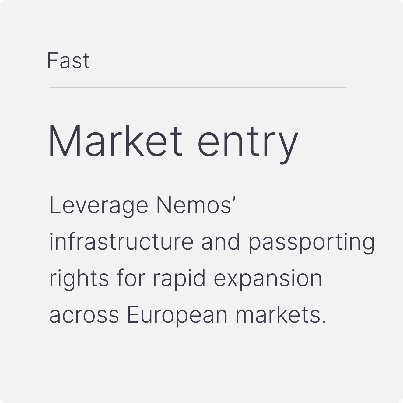 Nemos equips distributors, placement agents, and advisors with direct access to Europe’s major markets through a single onboarding process. No local entities, no additional licences needed - just seamless market entry. We ensure full compliance, reduce operational complexity, and accelerate time to market.